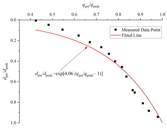 In this study, the load–displacement behavior is modeled using experimental data curves. Based on 40 centrifuge model test results, the pre-peak resistance and penetration depth are normalized by their respective peak values. After analyzing the characteristics of the pre-peak penetration–resistance profile, a single-parameter formula, Equation (9), is proposed to describe the profile. The parameter is a function of the dimensionless parameter which takes into account the undrained shear strength of the stiff and soft layer, the thickness of the stiff layer, and the spudcan diameter.