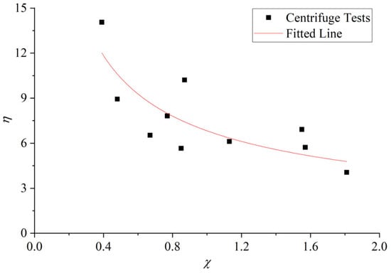 For each centrifuge test case, the normalized pre-peak penetration–resistance curve is fitted using the Generalized Least Squares regression to the parameter , as shown in Figure 4. The distribution of the 40 are shown in Figure 5. The load–displacement model factor can be expressed as a function of the soil parameters in Equation (10). The soil parameters are non-dimensionalized as a single parameter . With the Generalized Least Squares (GLS) regression based on 40 sets of and , the best fitted values of parameters and in Equation (10) are 6.83 and , respectively.