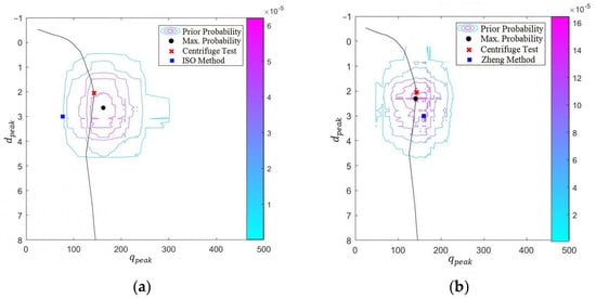 From the penetration profile of the centrifuge test case, six points prior to the peak resistance are selected as the monitoring points. For each of the 500 sets of possible peak resistance and depth, the monitoring points are used to calculate the likelihood probability based on Equations (10)–(14). At each monitoring point, the Monte Carlo method is used to calculate the probability of each monitoring point, given the peak resistance and depth. A likelihood probability contour was generated by connecting possible peak points with equal likelihood probability, as shown in Figure 7.
