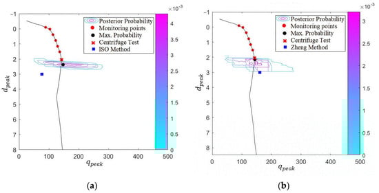 Combining the prior probability and the likelihood probability, the posterior probabilities were computed using Equation (8) and visualized in a posterior probability contour, as shown in Figure 8. In Figure 8, the red dot “●” represents the monitoring points during penetration. The colored solid lines are contour lines connecting points with identical probability for the peak resistance. The black dot “●” marks the most probable peak resistance point predicted by the Bayesian method. The red cross “×” depicts the actual peak resistance point, which is extracted from the centrifuge test profile.