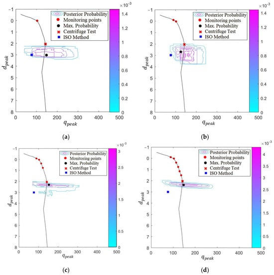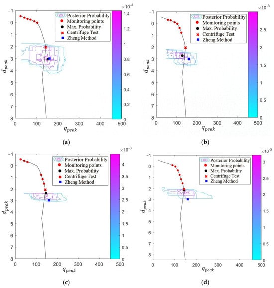 Regarding the six monitoring points, subsequently placed at different positions to the tested profile, the posterior probability obtained based on the Zheng method is calculated to further study the effect of the monitoring point position. As shown in Figure 10, the monitoring points are placed progressively closer to the peak resistance point in sub-figures (a) to (d). The discrepancies between the predicted peak resistances and the centrifuge test are also shown in Figure 10. It is shown that the closer the monitoring points are to the actual punch-through location, the more accurately the probabilistic predictions align with the actual centrifuge test.