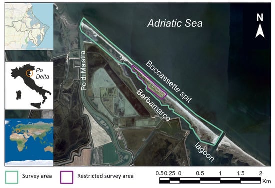 The pilot site, situated along the spit of Boccassette in the northern Adriatic Sea within the Po Delta area, extends over a linear distance of approximately 4500 m and separates the Barbamarco lagoon from the Adriatic Sea (Figure 1). The Barbamarco lagoon has been developing in the northern portion of the Po Delta since 1850. It is a small (7 km2) coastal lagoon, with an average depth of 0.95 m []. The hydrodynamic dynamics of the lagoon involve intricate interactions, including water exchange with the nearby northern Adriatic Sea through the Bocca Sud and Bocca Nord lagoon mouths, as well as freshwater inflows originating from the Po River via the mouths and inflow channels from Pila di Tramontana and Pila di Maistra [,]. Its geomorphological structure results from significant human-induced activities and interactions, and, today, it can be considered a human-driven ecosystem [,]. Over the last decade, the lagoon system has been subjected to several interventions that have substantially shaped its current coastal geomorphology. In particular, interventions were directed at reinforcing and consolidating the barrier island, stabilizing the two lagoon inlets, creating an internal channel network, and constructing a series of artificial intertidal islands [].