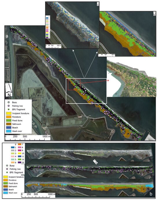 (a) Spatial distribution of EPS fishing boxes, EPS fragments, and buoys along the Boccasette spit in the Northern Adriatic. The main panel presents a geomorphological map of the entire spit, showing the point locations of detected items. Three insets are included: item abundance represented through a grid map (left), localized item distribution overlaid on geomorphological features (middle), and a 3D perspective view of item positions relative to the landform (right). (b) From top to bottom are the following: the frequency of item occurrence, the spatial localization of items, and an eco-geomorphological map highlighting the dominant morphodynamic processes across the study area.