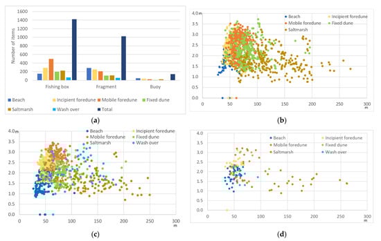 (a) The relationship between the distance from the shoreline and elevation of the various items identified during the three surveys, (b) distribution of the observed items during the three surveys, categorized by eco-geomorphological classes, (c) relationship between the distance from the shoreline and elevation of items always present during the three surveys, (d) distribution of the items according to the different eco-geomorphological zones.