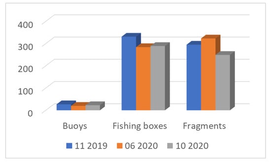 The analysis of collected items from the surveyed sub-area of approximately 0.18 km2 (refer to Figure 1 for the sub-area’s location), which constitutes 22.5% of the overall study area, indicates that 653 items were recorded during the flight in November 2019, 627 in June 2020, and 561 in October 2020 (Figure 4). Most of these items were EPS fishing boxes and fragments, with fewer than 30 buoys identified altogether (27, 20, and 23, respectively). Interestingly, EPS fishing boxes exceeded fragments in absolute number in November 2019 and October 2020; however, fragments were more numerous than fishing boxes in June 2020.