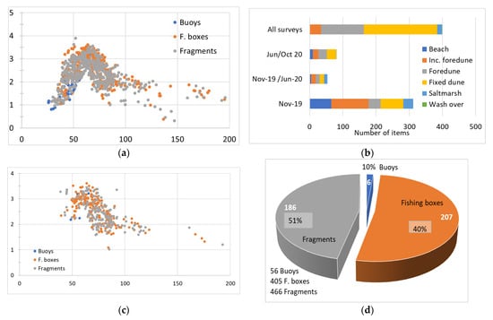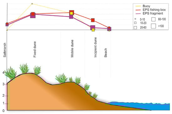 Furthermore, the results (Figure 5a) show that the buoys were mainly located near the sea, at a maximum distance of 67 m (mean distance of 47.8 m ± 9.8 m), with an elevation ranging from 0.8 to 3.2 m (mean elevation of 1.98 ± 0.68 m). In contrast, EPS fishing boxes and fragments were usually located farther from the shoreline, between 29 and 80 m (mean distance 195.8 ± 69.3 m) and elevations from 0.3 to 3.9 m (2.4 ± 0.6 m). Additionally, these items were primarily associated with mobile foredunes, fixed dunes, and, to a lesser extent, incipient foredunes (Figure 5b). However, in November 2019, the items were first linked with incipient foredunes and secondarily with the beach and fixed foredunes.