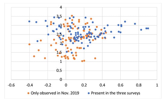 Finally, we analyzed the relationships between elevation and elevation change across the survey periods for the 189 items identified on the beach and incipient dunes of the sub-survey area (Figure 1) to exclude the influence of vegetation. The results, illustrated in Figure 6, reveal that items consistently found throughout all survey periods are typically situated at higher elevations (ranging from 1 to 3.5 m, with an average of 2.23 ± 0.65 m) and are generally associated with positive elevation changes. Conversely, items noted solely in November 2019 showed a mix of negative and positive elevation changes, with elevations between 1.49 and 3.5 m (average value 2.6 ± 0.41 m).