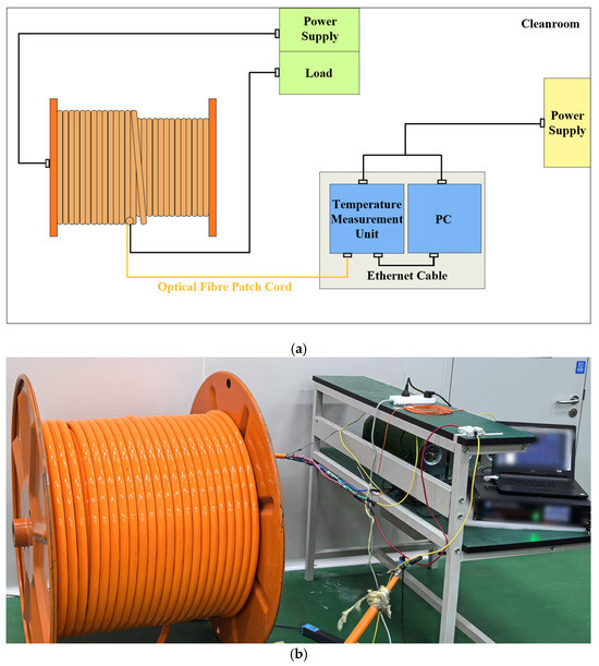 The experimental work was carried out at HMN Technologies Group Co., Ltd., Suzhou, China, using a newly developed multi-layer winding test rig specifically designed for this study. The test rig primarily consists of a multi-layer winding structure for the optoelectronic cable (HMN Technologies Group Co., Ltd., Suzhou, China), distributed temperature sensing system (Wuxi Brillouin Electronics Technology Co., Ltd., Wuxi, China), and power supply (ITECH Electronics Co., Ltd., Nanjing, China) and load system (Shenzhen Skonda Electronic Co., Ltd., Shenzhen, China). A schematic diagram of the overall layout is presented in Figure 1.