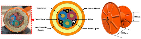 The experiment utilized a drum made of alloy steel, with an outer diameter of 500 mm and a length of 800 mm. To accelerate the temperature rise and thus reduce the experimental duration, the number of winding layers of the NAOC was maximized. A 405 m section of NAOC was selected as the test sample. This cable was fully wound onto the experimental drum, forming a total of eight winding layers, with each layer comprising approximately 21 to 22 turns. The experimental cable sample and drum are shown in Figure 2.