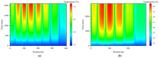 Figure 4a,b depict the time–position temperature distribution of the optoelectronic cable under a 15 A current for the eight-layer and six-layer winding configurations, respectively. These figures illustrate the temporal evolution of temperature along the longitudinal direction of the multi-layer winding optoelectronic cable, with temperature values represented by a color gradient. The results reveal a periodic temperature pattern along the cable length at various time points, where the number of thermal peaks corresponds to the number of winding layers. This observation confirms that the number of winding layers directly influences the longitudinal temperature distribution. Additionally, although the temperature increases over time in all regions, the rate of the temperature rise varies significantly along different segments of the cable. This variation reflects spatial differences in heat generation and dissipation. Accordingly, further analysis is warranted to examine the temperature distribution at specific time points and to evaluate the temperature rise at critical locations.