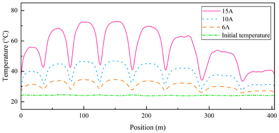 Full-length temperature distribution of the eight-layer winding optoelectronic cable under different current conditions.