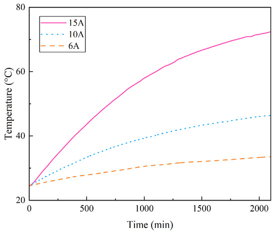 Figure 5 presents the full-length temperature distribution of the NAOC wound in eight layers under three current conditions, captured at the same time point. Since the 15 A condition reached the preset threshold temperature earlier, the comparison is made at 2100 min—the end of the 15 A experiment. The results show that the sequence of temperature gradients remains consistent across current conditions, indicating that current amplitude primarily influences the gradient magnitude rather than the distribution pattern. The outermost layer consistently exhibits the lowest temperature, underscoring the dominant role of convective heat transfer between the cable and the ambient air in overall cooling. The highest temperature is consistently observed in the fourth layer, with adjacent layers displaying similar temperatures, forming a distinct high-temperature zone. This region is of particular concern due to potential thermal risks. As the current increases, the temperature gradient becomes more pronounced, with the maximum temperature in the hottest layer exceeding three times that of the coolest layer. Figure 6 shows the temperature rise curves of the hottest layer under the same three current conditions. The results clearly demonstrate significant differences in the rate of temperature increase. Over the same time interval, the average temperature rise rate under the 15 A condition is approximately twice that under 10 A and about five times that under 6 A.