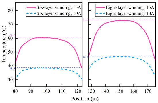 Comparison of full-length temperature distribution in multi-layer winding NAOCs: (a) eight-layer winding, 15 A current; (b) six-layer winding, 15 A current.