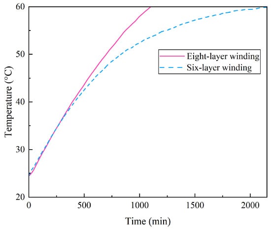 Figure 8 shows the temperature rise curves up to 60 °C at the hottest location of the optoelectronic cable under different winding layer configurations with a current of 15 A. During the initial 300 min, the curves corresponding to the six-layer and eight-layer windings nearly overlap, both exhibiting a linear growth trend. This indicates that the number of winding layers has a negligible influence on the initial temperature rise rate. However, beyond 300 min, the curves begin to diverge significantly. Although the temperature rise rate decreases for both configurations, the reduction is markedly more pronounced in the six-layer winding. The time required to reach 60 °C is nearly twice as long for the six-layer configuration compared to the eight-layer configuration. These observations suggest that, in the later stages of heating—when the cable approaches thermal equilibrium—the number of winding layers becomes a dominant factor influencing the temperature rise.
