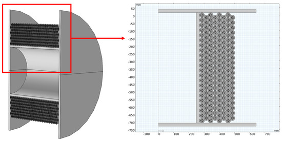 The geometric model of the NAOC was constructed based on the structural dimensions provided in Table 2. A corresponding multi-layer winding configuration was then developed. Both the multi-layer winding NAOC and the drum exhibit strict symmetry about the drum axis, resulting in two-dimensional characteristics in the plane perpendicular to the axis, with negligible variation along the axial direction. The internal physical fields and boundary conditions are distributed in an axisymmetric manner. Within the studied temperature range, conventional two-dimensional models lack sufficient accuracy, whereas two-dimensional axisymmetric models yield results comparable to those of three-dimensional models. Therefore, to reduce computational complexity, a two-dimensional axisymmetric model was adopted [1]. The model structure is illustrated in the accompanying Figure 9.