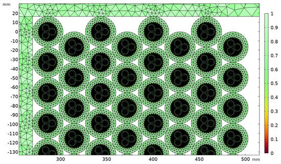 Based on the comparison, the calculated results for the protective layer of the cable together with the drum region are similar when using medium-high and high mesh densities. Given the significantly reduced computation time, the medium-high mesh density is selected for this region. Accordingly, the final simulation model adopts a medium-high mesh density for both the conductor and insulation region and the protective layer of the cable together with the drum region. The mesh division is illustrated in Figure 10, comprising a total of 2.88 × 107 elements with an average element quality of 0.75.