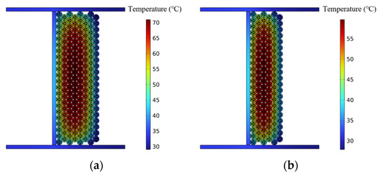 Simulated results of the temperature distribution in multi-layer winding NAOCs: (a) eight-layer winding, 15 A current; (b) six-layer winding, 15 A current.
