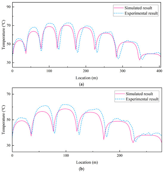 Based on the temperature data corresponding to the coordinates of each layer and turn of the optoelectronic cable in Figure 11, and applying Equations (1)–(3), the full-length temperature distribution of the cable under multi-layer winding conditions was calculated. A comparison between the experimental and simulated results for the two operating conditions is presented in Figure 12.