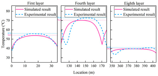 To enable a more in-depth comparative analysis of the temperature distribution, the investigation focuses on two aspects: intra-layer temperature difference and inter-layer temperature difference. For the eight-layer winding configuration, the innermost layer (first layer), the outermost layer (eighth layer), and the highest temperature layer (fourth layer) are selected for analysis. For the six-layer winding configuration, the first layer, sixth layer, and third layer are selected accordingly. Figure 13 and Figure 14 present the single-layer temperature distribution under the two conditions, based on both simulated and experimental results.