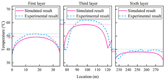 The single-layer temperature distribution results exhibit an arched profile in each layer, with lower temperatures at both ends and relatively higher local temperatures near the center. The extent of intra-layer temperature differences differs among layers, reflecting the degree of temperature non-uniformity within each layer. The dashed lines in the figures mark the maximum temperature within each layer, while the minimum temperature typically appears near the flange. Based on the temperature distribution data, the extreme values of intra-layer temperature differences are extracted to compare experimental and simulated results, as presented in Table 7.