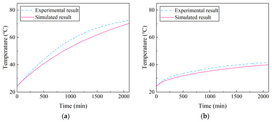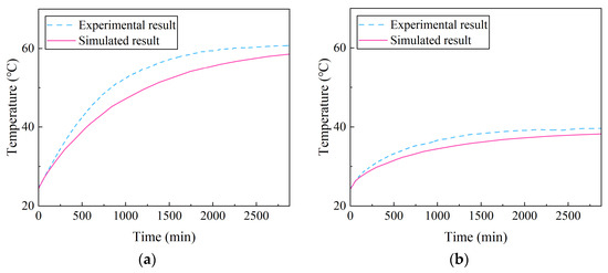 To validate the simulated results, a comparative analysis was conducted between the experimental and simulated temperature distributions. The eight-layer winding and six-layer winding configurations under a 15 A current were selected as representative cases. The numerical analysis was performed with the same end time as the corresponding experiments. Figure 11 presents the simulated temperature distributions of the multi-layer winding NAOCs under these two conditions.