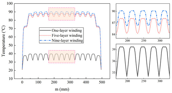 In practical applications, variations in operating water depth result in different numbers of winding layers on the drum. In this study, transient numerical simulations were performed by applying a 30 A current to models featuring one-layer, five-layer, and nine-layer winding configurations. These configurations were selected as three groups from the range of one to ten layers. At 400 min, prior to reaching the temperature limit, temperature data were extracted along the drum axis within the highest temperature layer. The corresponding temperature distributions in the highest temperature layer for the one-layer, five-layer, and nine-layer winding configurations are presented in Figure 17.