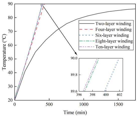 To further investigate the influence of the number of winding layers on the temperature rise of multi-layer winding NAOCs, simulations were conducted under a current of 30 A for configurations with two-layer, four-layer, six-layer, eight-layer, and ten-layer winding configurations. The temperature rise at the maximum temperature point for each case is shown in Figure 18, which clearly illustrates the significant effect of the number of winding layers on the temperature rise. Based on a quantitative analysis of the curves in the figure, the corresponding maximum operation times under each winding configuration at 30 A are presented in Table 9. It can be observed that when the number of winding layers exceeds eight, the maximum operation time tends to stabilize, whereas a substantial increase in the operation time is observed as the number of winding layers decreases.