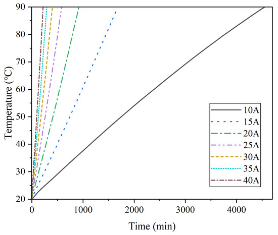 Taking the ten-layer winding configuration as an example, numerical simulations were performed to further investigate the influence of current (15 A, 20 A, 25 A, 30 A, 35 A, and 40 A) on the maximum operation time of the multi-layer winding NAOCs.