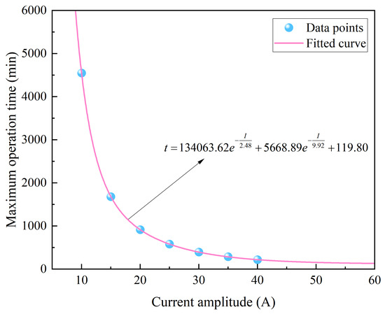 The temperature rise curves of the ten-layer winding NAOC under different current conditions until reaching the maximum operating temperature are shown in Figure 19, clearly demonstrating the significant influence of the current amplitude on the temperature rise. Based on these results, the maximum operation times corresponding to each current amplitude were determined. A nonlinear curve fitting was then performed to establish the relationship between the current amplitude and maximum operation time under this winding configuration, as expressed in Equation (13). The fitted curve is presented in Figure 20.