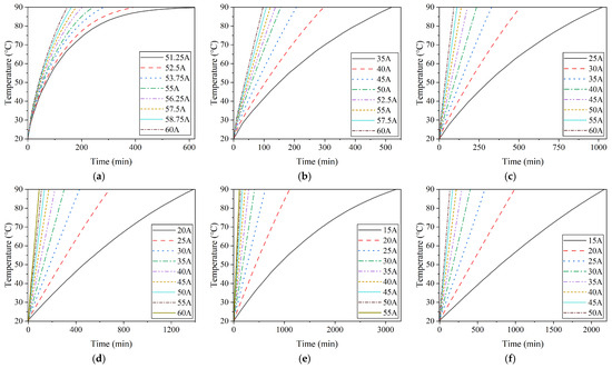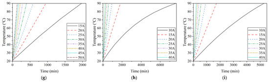 where t is the maximum operation time and I is the current amplitude. To further explore the quantitative relationship between the current amplitude and maximum operation time under different numbers of winding layer configurations, a predictive model for the maximum operation time was established. Numerical simulations were conducted for multi-layer winding NAOCs with one-layer to nine-layer winding configurations under various current conditions. The corresponding temperature rise curves up to the limit temperature of 90 °C are presented in Figure 21.