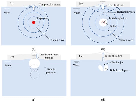 The Arctic region harbors abundant resources of global strategic significance. Its hydrocarbon reserves constitute approximately 20% to 32% of the global marine gas hydrate resources [1], while its coal deposits exceed the world’s total proven reserves [2]. For decades, the immense mineral resource potential and development prospects of the Arctic have remained a central focus of global geopolitics and economics [3,4,5]. Accelerated melting of the Arctic ice cap, driven by global climate change, has expanded the region’s strategic significance beyond mere resource endowment to encompass geostrategic transit corridors. Currently, both the Northern Sea Route and the Northwest Passage are commercially navigable during summer months. Research and practical experience demonstrate that utilizing Arctic shipping routes can reduce voyage distances by up to 40% and significantly lower transportation costs by approximately 30% compared to traditional routes (e.g., the Suez Canal route) [6]. This unlocking of navigational potential positions Arctic routes as a critical variable in reshaping global trade patterns and geopolitical dynamics, with their strategic importance becoming increasingly pronounced [7]. Against this backdrop, competition among circumpolar states for strategic dominance has intensified. Consequently, highly efficient and reliable ice-breaking technology has become an indispensable core capability for securing critical shipping lanes, supporting sustainable polar resource development, and ensuring operational mobility. However, conventional ice-breaking techniques, such as icebreaker propulsion and mechanical ice-breaking, face limitations including slow response times and low energy efficiency. These shortcomings render them inadequate for meeting the demands of precise resource extraction in polar regions, efficient waterway maintenance, and the rapid deployment of infrastructure. In contrast, underwater explosion ice-breaking technology has become the research focus in the field of Polar Engineering and ice disaster prevention due to its high energy efficiency ratio and fast response characteristics [8,9].