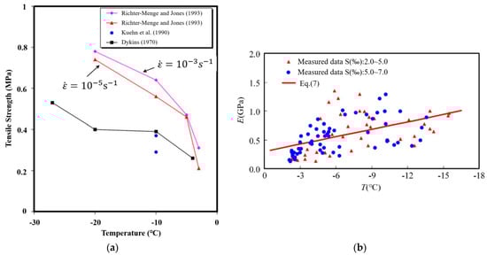 Effect of temperature on partial mechanical properties of sea ice: (a) effect of temperature on tensile strength of sea ice [15] (Data sources: Richter-Menge and Jones 1993 [22], Kuehn et al., 1990 [23], Dykins 1967/1968 [24,25] via [15]; Figure labels Dykins (1970) as published in [15]); (b) effect of temperature on elastic modulus of sea ice [16]. Note: Ji et al. tested the strain rate range (0.03–1.65 MPa/s), where the elastic modulus has no strain rate dependence.