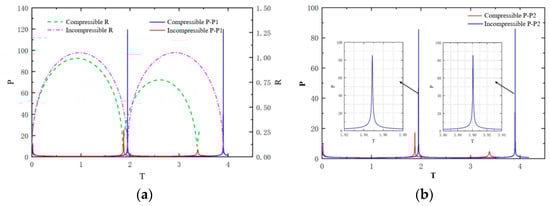 Comparisons of bubble radius and pressures at the measurement points in compressible and incompressible flow fields for two bubble pulsation periods: (a) comparisons of bubble equivalent radii and pressures at P1 (2, 0) and (b) comparison of the pressures at P2 (2, 2) [75].