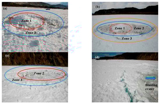 Typical blasting crater types and post-blasting features: (a) mountain-shaped; (b) standard; (c) fully broken; (d) post-blasting ice cracks (width: 10 cm, depth: 35 cm). Note: The inclination toward the crack center may result from radial debris displacement or snow cover; no slope measurement was reported in the source study [56].