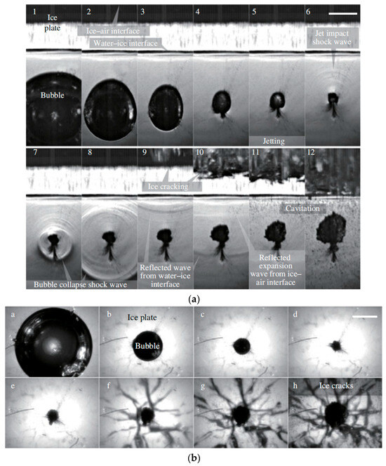 High-speed image of a bubble collapse under a 20 mm-thick ice layer: (a) side view; (b) bottom view. Scale bars, 10 mm [35].