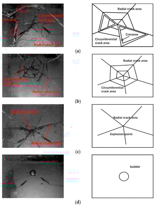 Typical damage patterns of the ice under bubble loads with sketch maps: (a) crevasse pattern; (b) radial and circumferential cracks pattern; (c) radial cracks pattern; (d) no cracks [98]. Schematic representation (not to scale).
