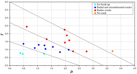Damage patterns of the ice depending on the distance parameter and thickness parameter [98].