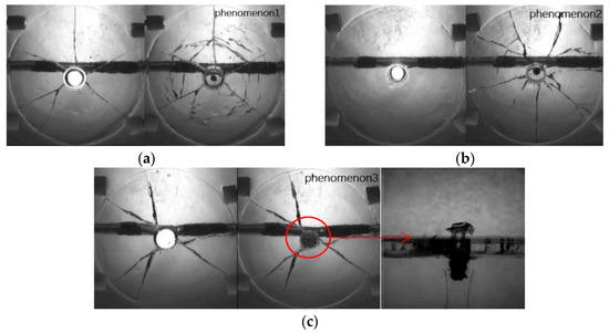 Ni et al. [99] studied the interaction between electric-spark-generated bubbles and perforated ice layers through experiments. Research has found that compared to intact ice layers with the same parameters, ice layers with a hole were easier to be cracked by the initial shock wave with bubble generation. Figure 8 clearly illustrates three typical ice-breaking patterns, revealing the unique response mechanism of perforated ice layers under specific conditions by comparing the rupture patterns under different parameter combinations.