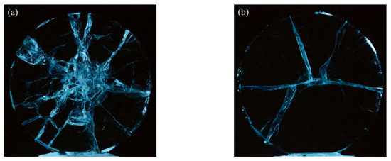 Final damage pattern of ice layer: (a) UEXB; (b) CGB. Specimen thickness: 10 mm [103].