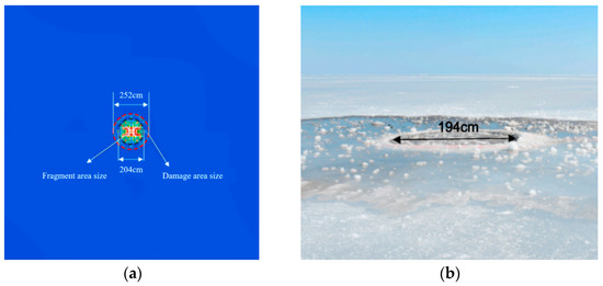 A comparison of the size of the ice layer damage between the numerical and experimental results: (a) the damage size of the ice layer by the numerical result; (b) the damage size of the ice layer by the experimental result [12].