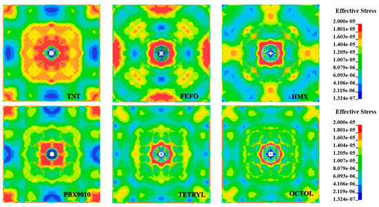 Wang et al. [32] established a numerical model based on the ALE method to investigate the ice damage characteristics under underwater explosions and air-contact explosion loading. The study revealed the effects of explosive type, shape, and length-to-diameter ratio on ice damage. Figure 12 compares the damage ranges of six explosives under underwater explosions, clearly demonstrating that HMX and OCTOL exhibit the largest failure diameters, thereby validating the superiority of high-energy explosives.