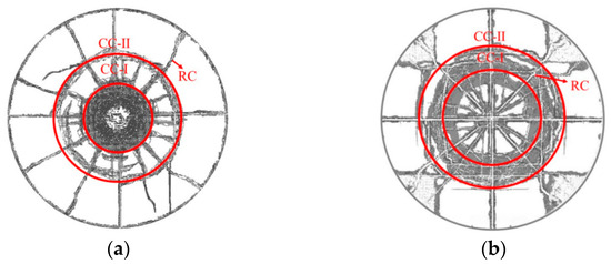 Yu et al. [103] vestablished an ice–water–gas bidirectional coupling numerical model using the ALE method, compared the ice-breaking mechanisms of underwater explosion bubbles (UEXB) and compressed gas bubbles (CGB), and revealed the differences in their ice-breaking mechanisms and optimal standoff distances. Figure 13 shows the final damage pattern of the ice layer caused by UEXB and CGB, including the distribution of radial cracks (RC) and circumferential cracks (CC).