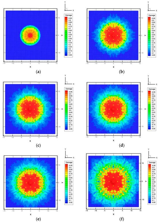 Vazic et al. [77] demonstrated that peridynamics is an effective method for simulating crack propagation in ice-structure interactions. Wang et al. [107] applied and verified a bond-based peridynamic model, effectively simulating the ice layer fragmentation caused by underwater explosion loading, and analyzed the key factors affecting the ice layer breaking radius. Figure 14 visually shows the ice layer destruction process under underwater explosion shock waves, clearly revealing the central damaged area’s expansion over time and thus verifying the model’s ability to simulate ice layer damage.