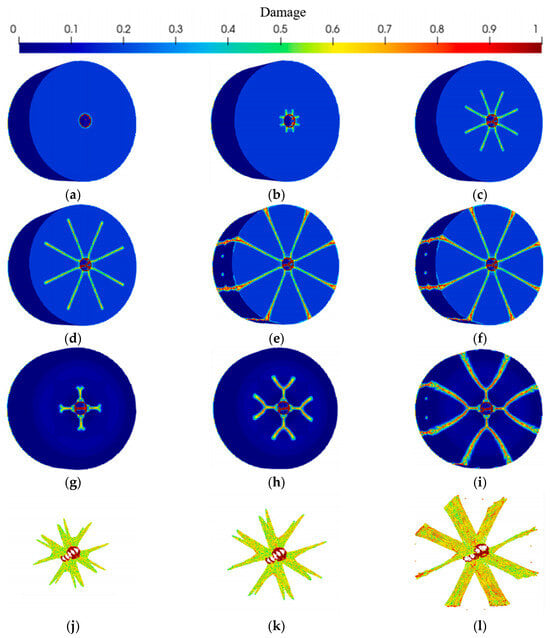 Cracks initiation and propagation process of ice hole PD model: (a–f) surface cracks initiation and propagation process; (g–i) cracks shape of central cross-section; (j–l) three-dimensional cracks morphology [108].