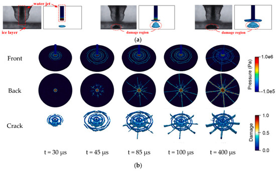Yuan et al. [100] conducted experiments on high-speed water jet impact on ice layers using a self-developed water jet generator in a transparent water tank, revealing the effects of different parameters on ice fracture patterns. Figure 10 illustrates the damage evolution process of ice layers under high-speed water jet impact under typical experimental conditions, showcasing the sequential development of radial cracks, penetration, and circumferential cracking.