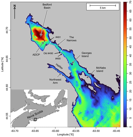 Study region showing the bathymetry of Halifax Harbour and its location in the Canadian province of Nova Scotia (inset). In the main diagram, colour represents depth in metres, relative to mean sea level, based on high-resolution mapping at a nominal 10 m scale, after adjusting the reference level (see text). Some place names are noted for reference in the text. The MacKay and Macdonald bridges crossing The Narrows are indicated by white lines, with the former being near the entrance to Bedford Basin. A dot indicates the location of an acoustic Doppler current profiler, and arrows indicate the locations of present-day tide gauges #490 and #491, as well as the “Old #490” tide gauge that provided data from 1895 to 2014.