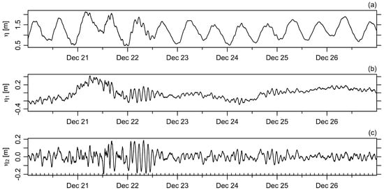Water levels observed during a week in December 2024, at tide gauge #491, near the entrance to Bedford Basin. (a) Raw signal, . (b) As (a), but minus the tidal signal. (c) As (b), but minus a smoothing cubic spline with 3 knots per day to remove effects of daily atmospheric forcing without removing the oscillation signals. In this panel, ticks indicate 2 h increments. Note that the panels have differing vertical scales to improve signal visibility.