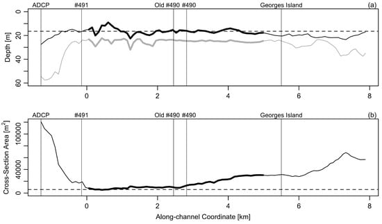 Variation in depth and cross-sectional area for sections that are orthogonal to the channel axis. The zero of the along-channel coordinate is taken as the location where the channel connects with Bedford Basin. Labels atop both panels indicate some place names, for reference to Figure 1. (a) Mean depth (black line) and maximal depth (gray line), with lines thickened in the region (of length l) taken to represent the channel in the Helmholtz calculation. The dotted line is the value of h shown in Table 1 and used in the calculations. (b) Cross-sectional area, again with a thickened line in the region taken to be the channel. The dashed line is the average area (taken as a in Table 1) computed for the region within half a kilometer of Bedford Basin.