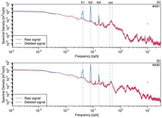 Spectra for tide gauges #491 and #490 (Figure 4) reveal that there is energy in a band from approximately h to h, i.e., consistent with the oscillations seen in time series, in addition to the expected tidal components in the diurnal (≈24 h), semidiurnal (≈12 h), and overtide (≈6 h) bands.