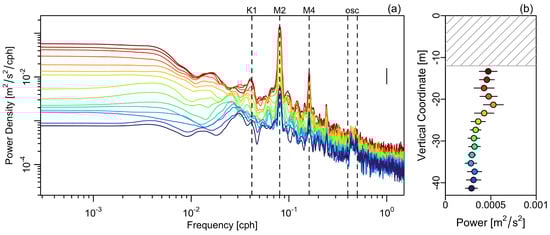 Depth-dependence of the spectrum of water velocity in Bedford Basin. (a) Spectra for depths at 2 m intervals, colour-coded by depth, as indicated in the second panel. As in Figure 4, the bandwidth and confidence interval are indicated at frequency cph and power density /. (b) Spectral power in the oscillation band as a function of height above the mean sea level. The horizontal lines in (b) indicate the standard deviation within the “osc” frequency interval, and the hatched region indicates the near-surface region in which data were not available.